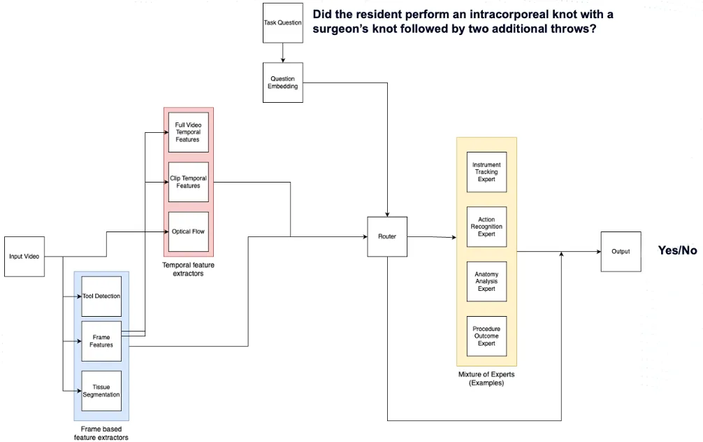 For instance, the system can assess whether a resident successfully performed an intracorporeal knot using a surgeon’s knot, followed by two additional throws. The router, leveraging a mixture of specialized “experts” – including instrument tracking, action recognition, anatomy analysis, and procedure outcome models – will determine whether a task was completed correctly. The final output is either a “yes” or “no” answer to the embedded question, an objective assessment of surgical performance that provides valuable insights into skill development and procedural proficiency.