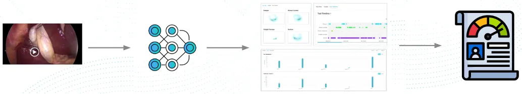 By repurposing some of our current ML models, like surgical tool detection and phase segmentation, SDSC designed the task assessment pipeline to evaluate questions regarding surgical performance. Given a surgical video input, the pipeline extracts frame-based features (such as tool detection, frame features, and tissue segmentation) and temporal features (such as full video temporal analysis, clip-based features, and optical flow). These extractors are then analyzed by a router, which determines the appropriate “expert” models to evaluate the task at hand.
